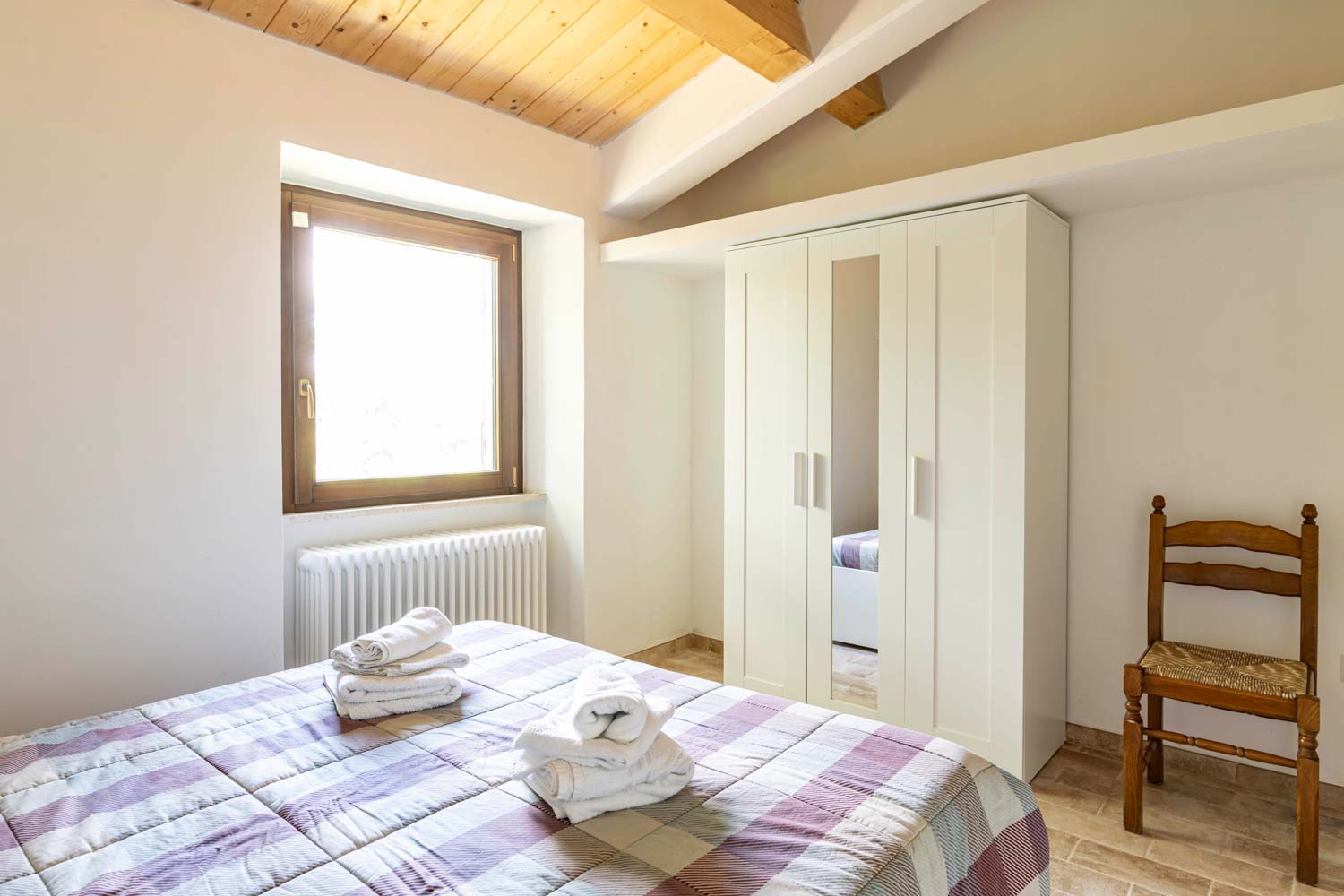 La casa si sviluppa su circa 95 m² su 2 piani con una comoda scala interna. Il piano terra presenta una cucina completamente attrezzata e un soggiorno, mentre il piano superiore ospita 2 camere da letto accessibili tramite un corridoio, perfette per ospitare due famiglie insieme.