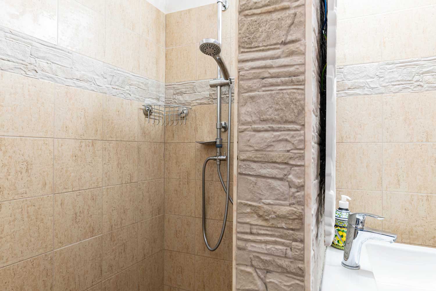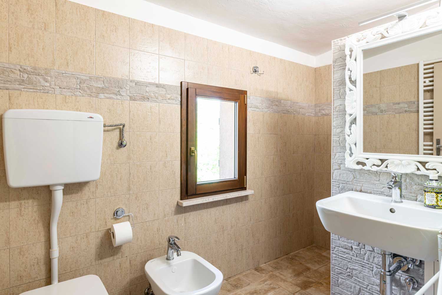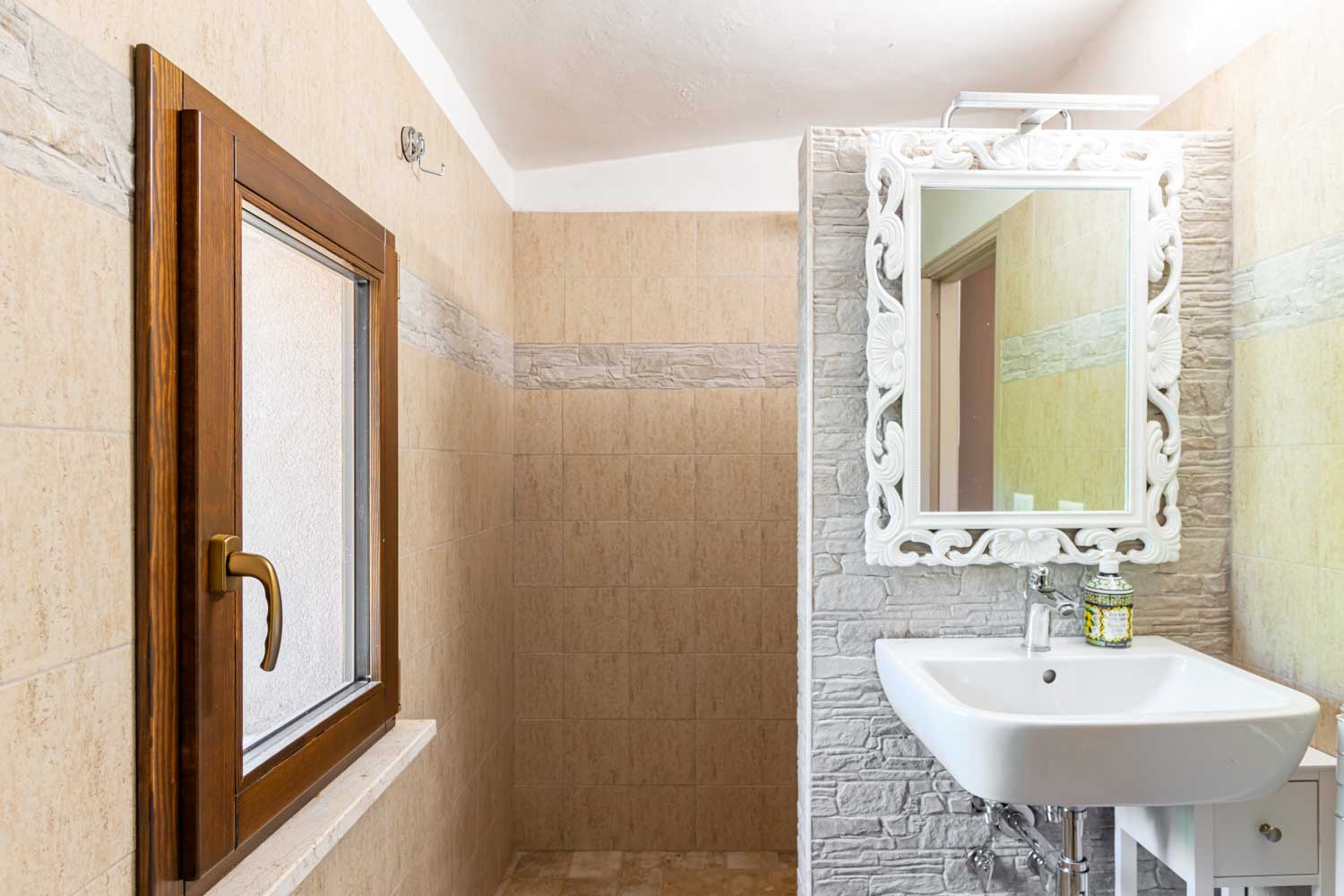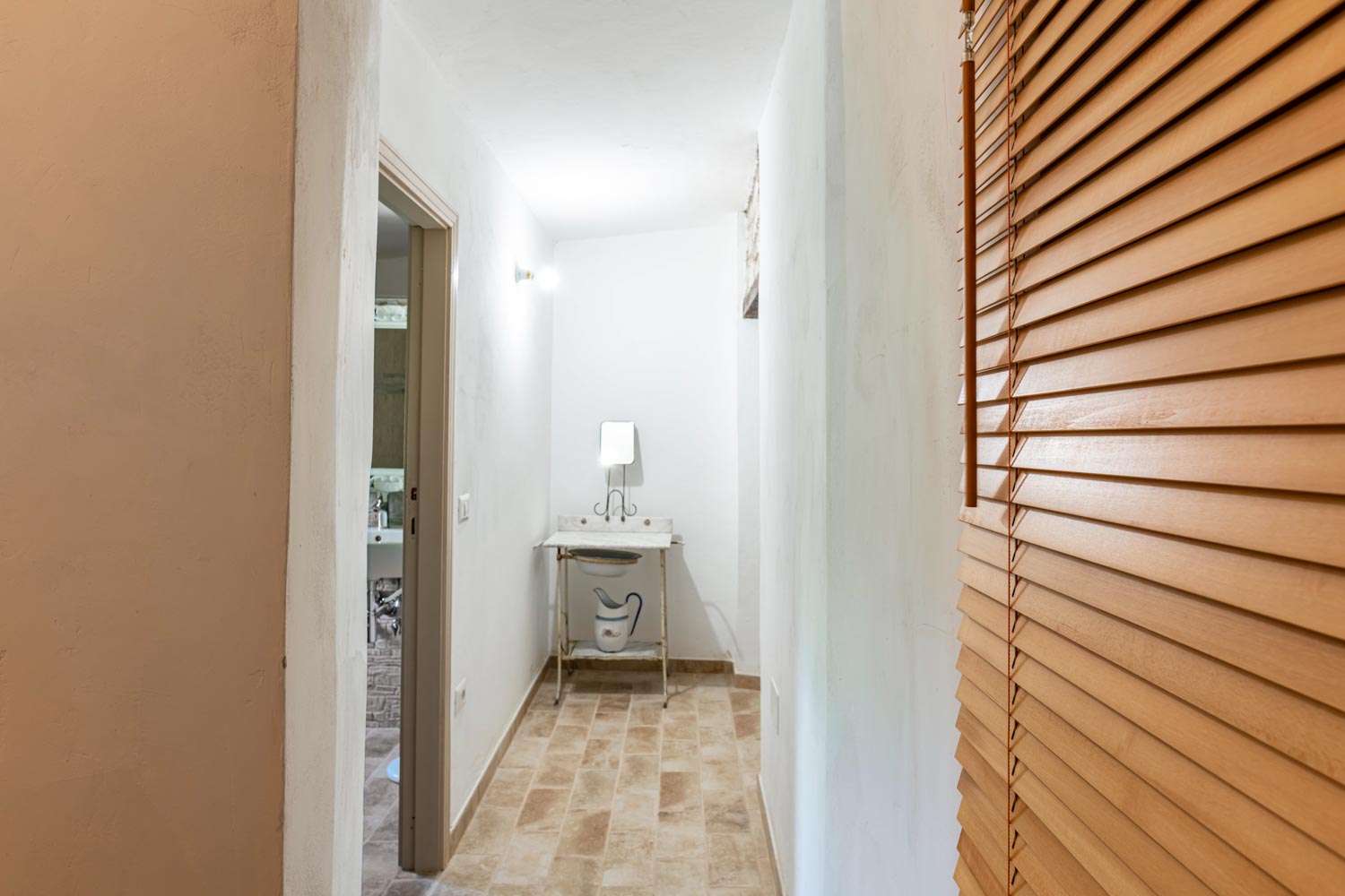 Bagno al piano superiore con doccia e anticamera, fornendo comfort e convenienza per tutti gli ospiti.